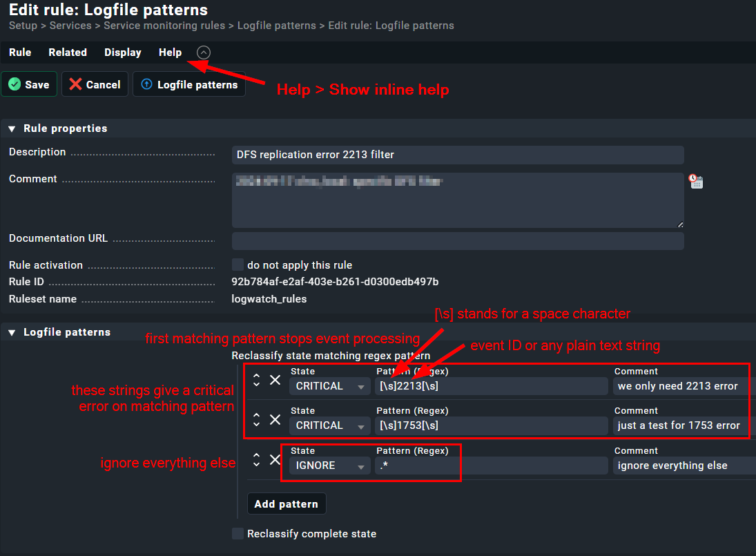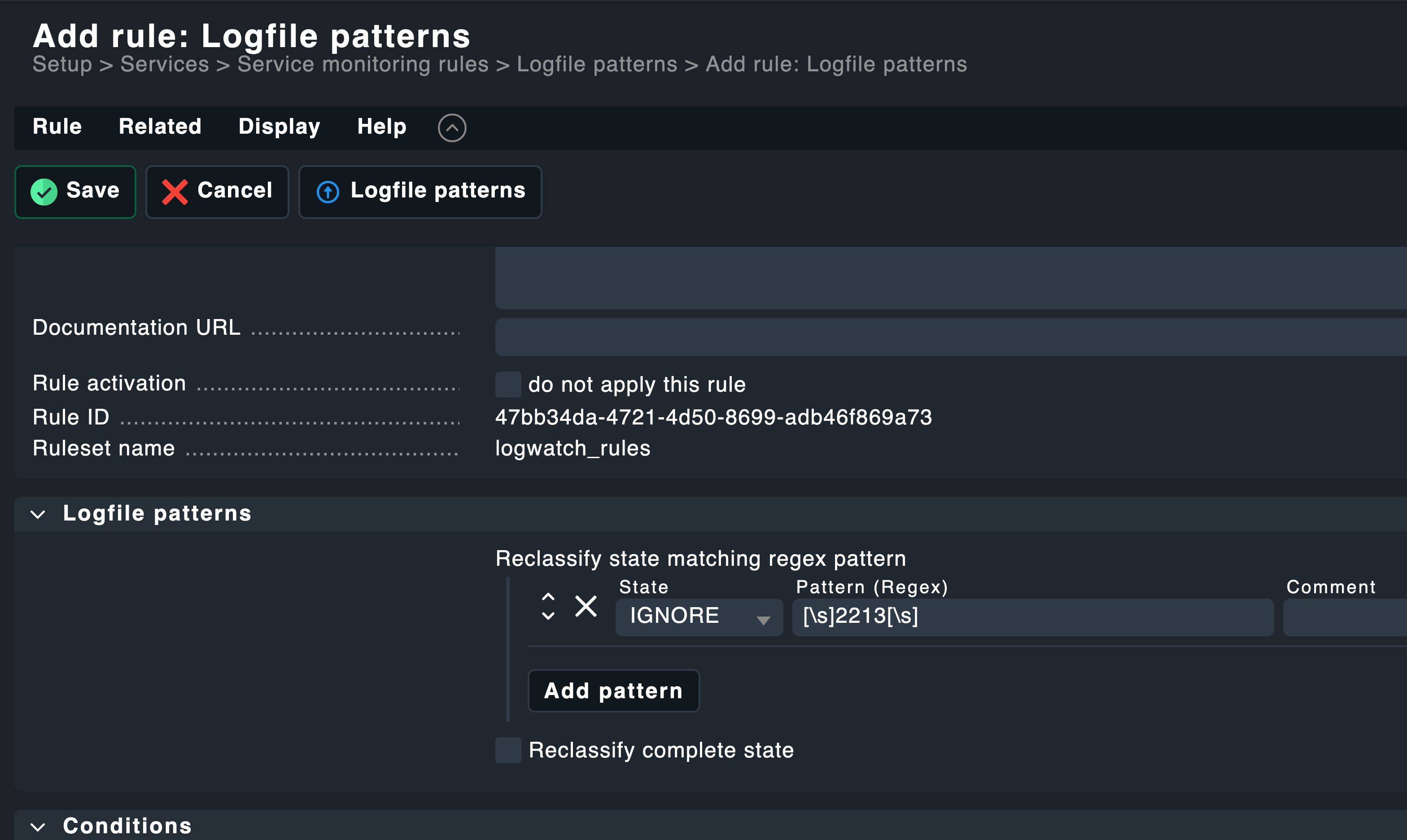Setup > Services > Service monitoring rules > Logfile patterns > Edit rule: Logfile patterns